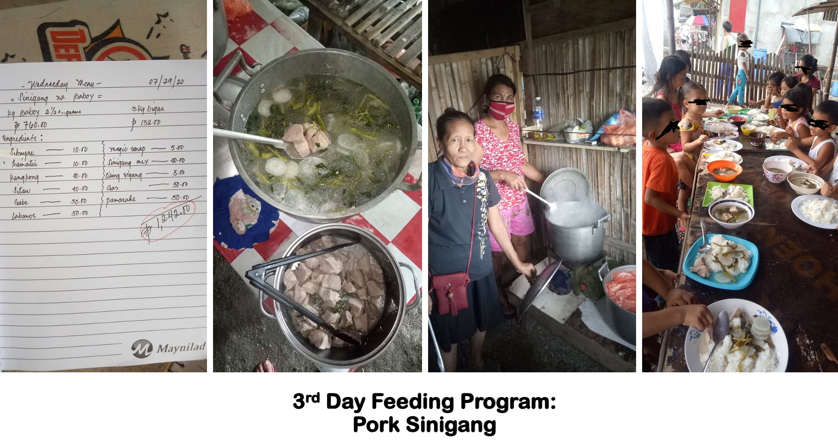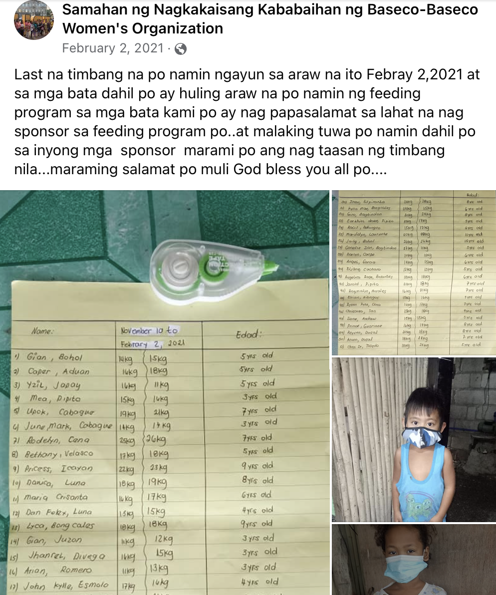 A total of 60 children and 12 older adults were provided lunch for 162 days (July-. I solicited donations from organizations and private individuals and turned over the amount to Mary Cris, group treasurer, weekly. Beneficiaries were selected based on the their households’ vulnerability to food insecurity. The leaders of the BWO voluntarily cooked and served the meals to the beneficiaries. After 162 days, majority of the beneficiaries were documented to have increased weight.