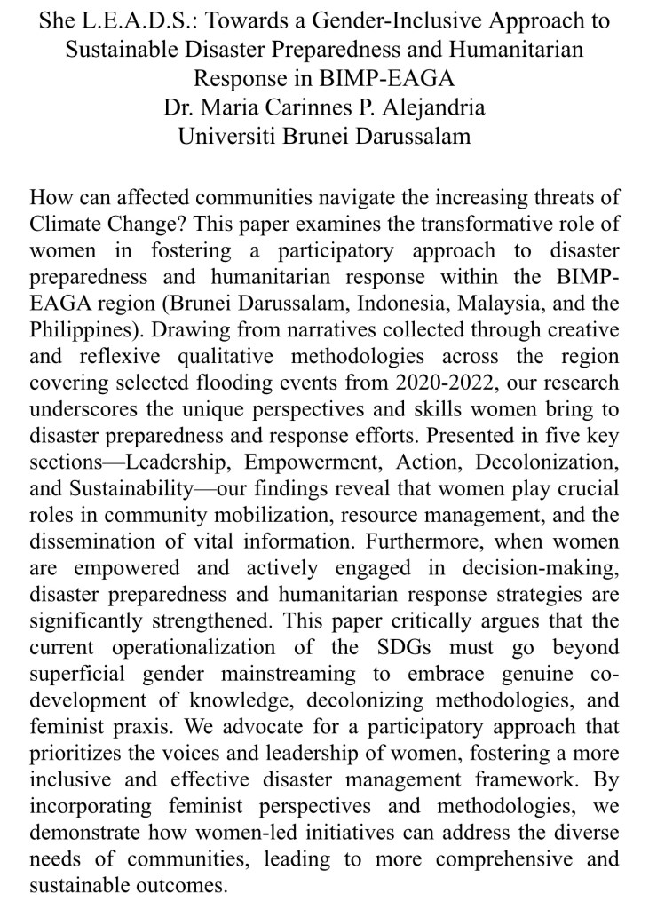 Looking forward to sharing our paper entitled She L.E.A.D.S.: Towards a Gender-Inclusive Approach to Sustainable Disaster Preparedness and Humanitarian Response in BIMP-EAGA at the 2024 ICUNSSI hosted by Mindanao State University-Iligan Institute of Technology HHI Resilient Communities on September 19, 2024.