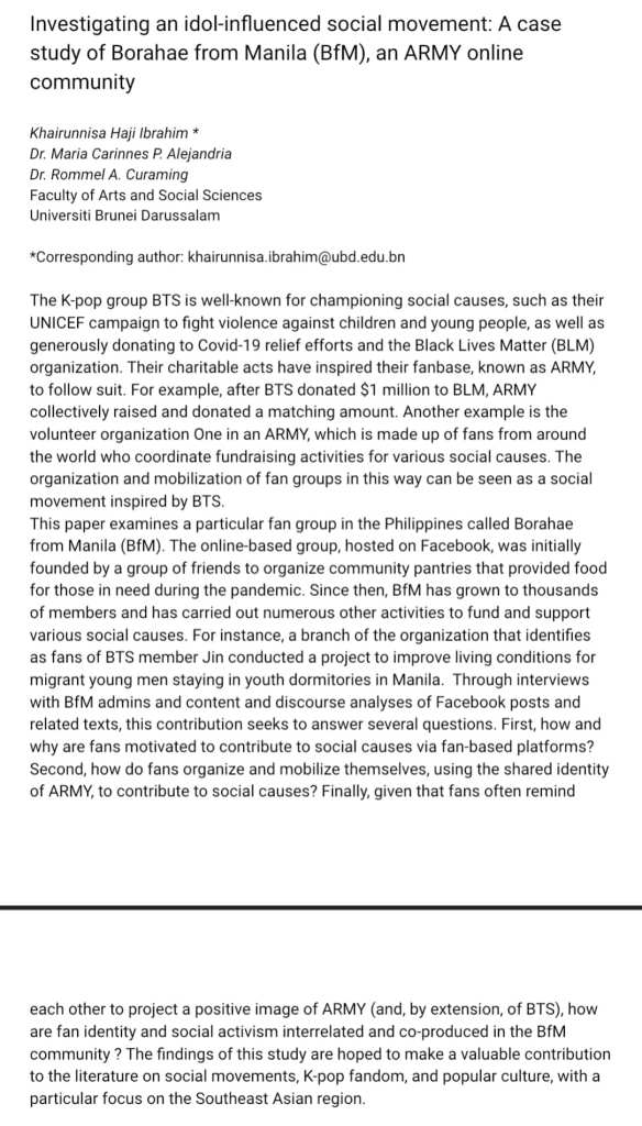 One of the projects I’m actively doing is documenting the narratives of the members of a newly established civil society organization called Borahae from Manila® which is an online community for Filipino/a/x ARMYs. With all the gloomy work I do related to disaster and health insecurities, this project has really been a respite. Our first paper (of 3) has been accepted to the 2nd International Asian Stardom and Celebrity Conference organized by Deakin University and Tsinghua University. We are grateful for the massive support we are receiving from the admin and members of BFM. Despite having overlapping commitments, we carry on because, as we lovingly joke, we have personal vested interest. We can’t fail our beloved BTS and fellow ARMYs. Sharing with you our abstract and our very first interview with the BFM admin.